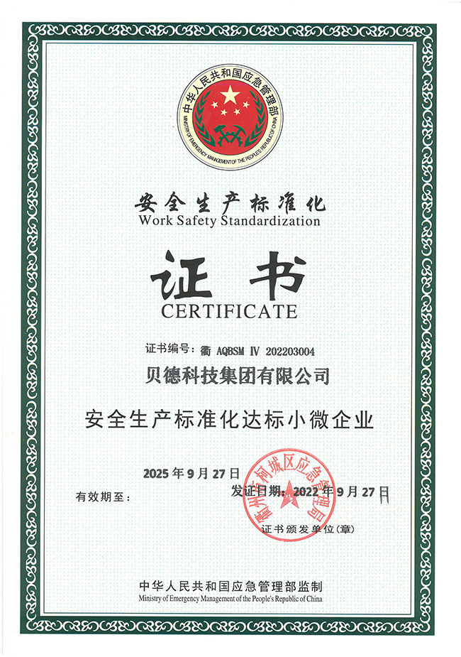 近日,貝德科技集團(tuán)順利通過評審,獲得安全生產(chǎn)標(biāo)準(zhǔn)化達(dá)標(biāo)小微企業(yè)”證書,這標(biāo)志著公司的安全生產(chǎn)規(guī)范化、制度化、科學(xué)化等各項管理水平邁上了新的臺階。