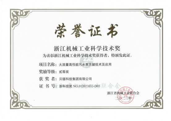 2023年12月,浙江省機械工業(yè)聯(lián)合會發(fā)布了《關于表彰2023年度浙江機械工業(yè)科學技術獎獎勵項目的決定》,表彰在機械工業(yè)科技工作中作出突出貢獻的單位和人員,共112個項目獲獎,其中一等獎14項、二等獎28項、三等獎70項,貝德科技集團有限公司憑借“大流量高性能污水泵關鍵技術及應用”項目榮獲二等獎!